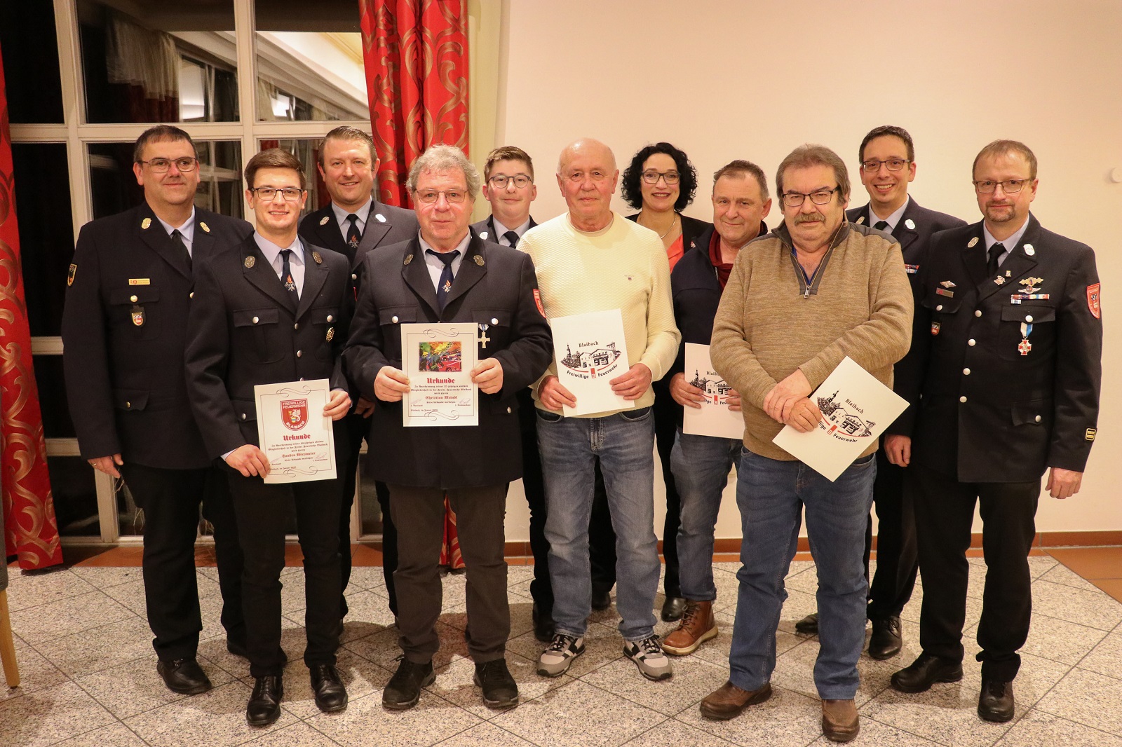 Kommandant Thomas Raab Vorstand Daniel Köppl oblag es danach, mehrere verdiente und langjährige Kameraden zu ehren. So sind Yannick Schötz und Sandro Wiesmeier seit 10 Jahren im aktiven Dienst tätig, Christian Meindl bereits seit 25 Jahren. 50 Jahre Mitglied im Feuerwehrverein sind Johann Ebner, Thomas Kiefl, Eberhard Scheuner und Eberhard Strotzer. Die Urkunde für 60-jährige Mitgliedschaft geht an Franz Breu, Johann Strotzer und Rudolf Wittmann, leider konnte sie die Ehrung nicht persönlich entgegennehmen. Ebenfalls verhindert waren Johann Bauer und Erich Vogl, die bereits lange 65 Jahre der Feuerwehr Blaibach angehören.