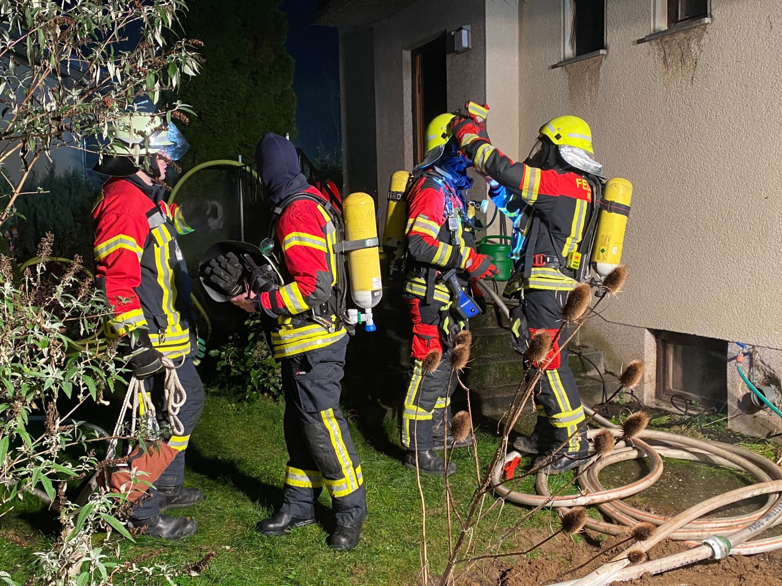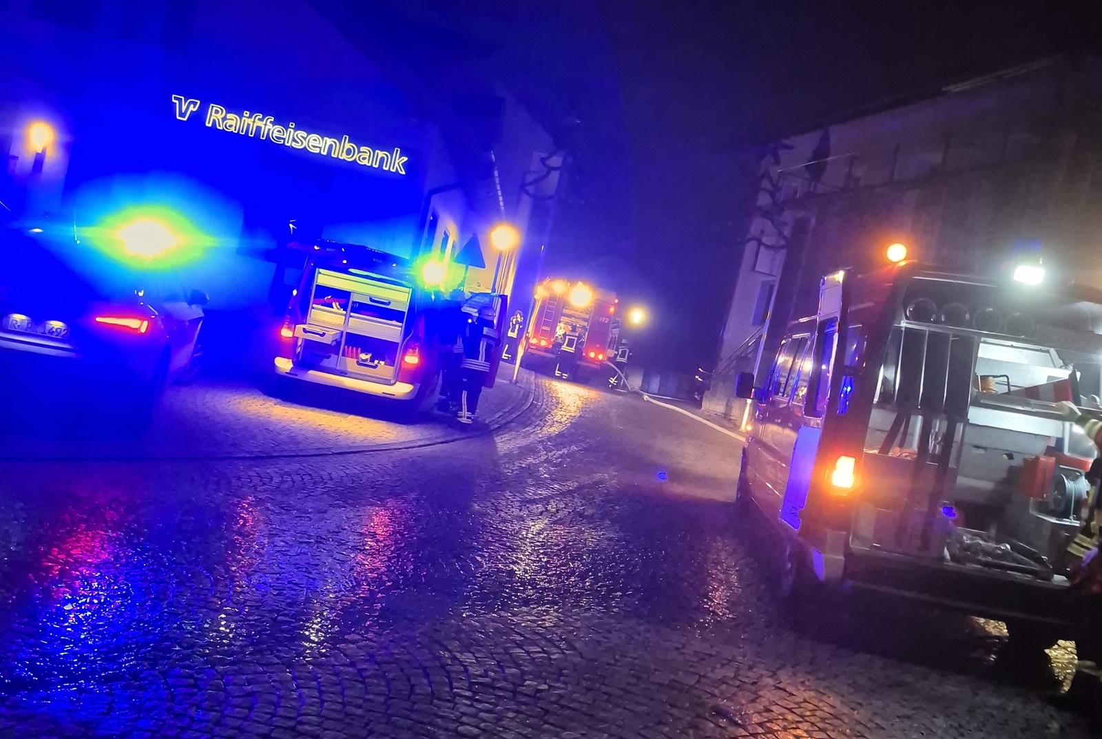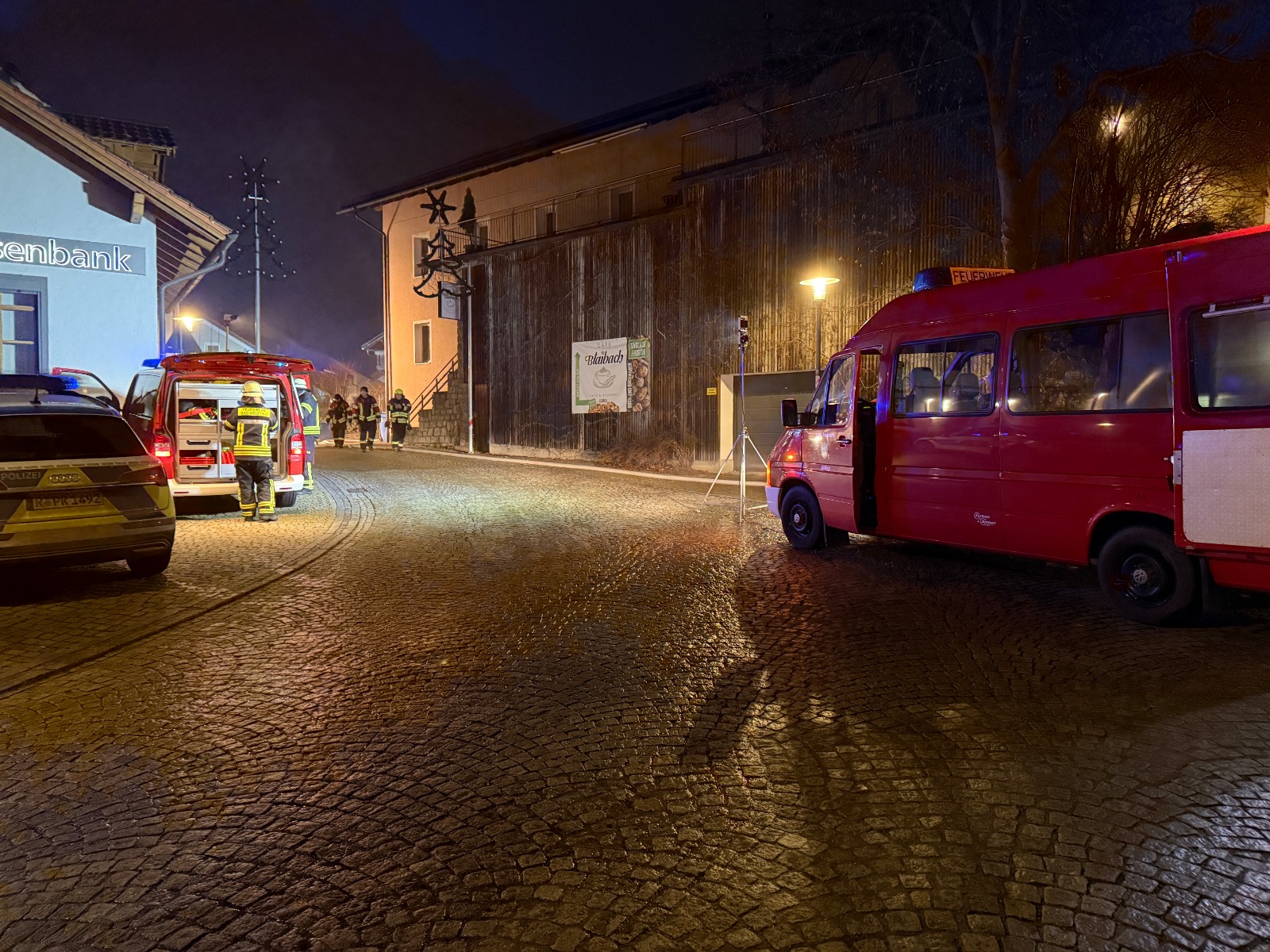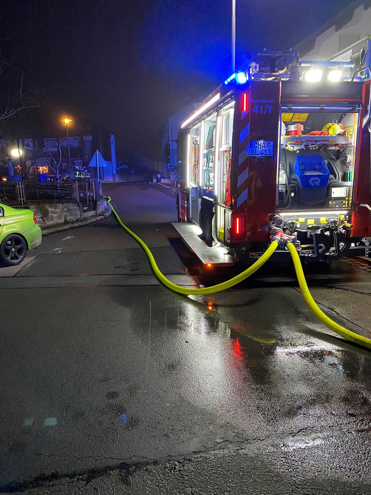 Gemäß dem Stichwort "B3 Person" wurden wir zu einem Zimmerbrand in den Ortskern alarmiert. Unser LF 20 war das erste Löschfahrzeug am Einsatzort. Die Besatzung begann sofort mit einem Löschangriff, ein Atemschutztrupp ging in den Innenangriff der zweite Trupp setzte einen Fensterimpuls, um den Brandraum herunterkühlen. Währenddessen baute die Besatzung unseres MZF eine Löschwasserversorgung zum LF20 auf. Die FF Bärndorf baute eine zweite Versorgungsleitung zum LF 20 auf. Danach setzte die ebenfalls eintreffende Feuerwehr Bad Kötzting einen Hochdrucklüfter vor die Eingangstür, wir ergänzten diesen Lüfter im weiteren Einsatzverlauf mit unserem Hochdrücklüfter. Die FF Lederdorn und die FF Bad Kötzting stellten zudem weitere Atemschutztrupps sowohl für den Innenangriff als auch zum Räumen des Brandraumes. Hiermit möchten wir uns bei den benachbarten Feuerwehren als auch bei dem BRK Cham und der Polizei für die hervorragende Zusammenarbeit bedanken. Desweiten möchten wir uns noch herzlich beim Cafe Blaibach für die herausragende Versorgung unserer Einsatzkräfte bedanken.