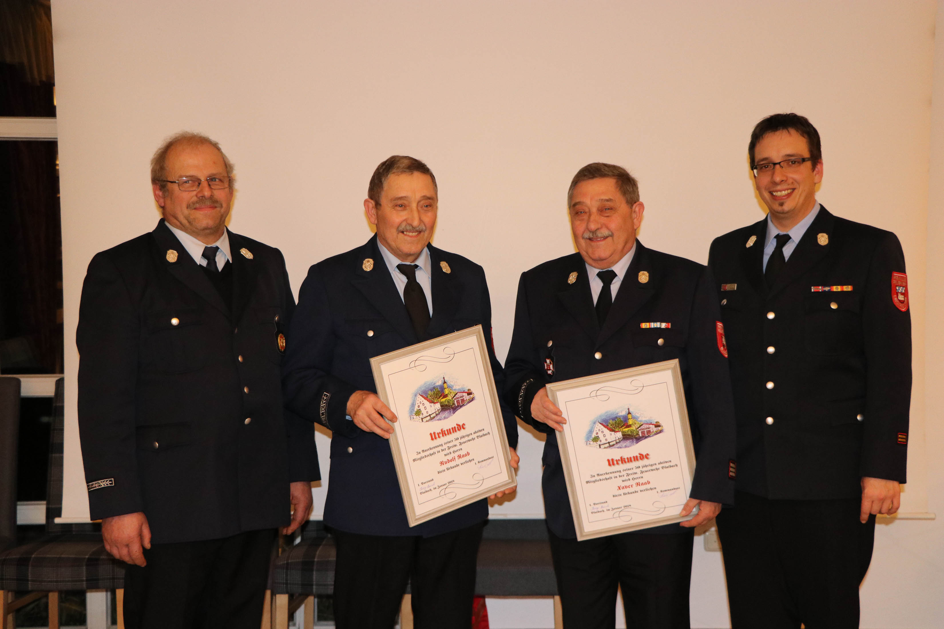 Für die langjährige Zugehörigkeit zum Feuerwehrverein konnten der Vereinsvorsitzende Krieger und Kommandant Raab im Anschluss Max Fischer und Peter Luppert für 50 Jahre Mitgliedschaft mit einer Urkunde ehren. Leider konnten einige Mitglieder nicht zur Versammlung erscheinen, ihnen werden Ihnen die Urkunde und die zugehörigen Glückwünsche natürlich noch überbracht. Dies sind Michael Bergbauer, Xaver Mühlbauer und Stefan Saurer (40 Jahre Mitgliedschaft), Arthur Bergbauer (50 Jahre), Erich Christl und Helmut Bielmeier (60 Jahre) und Ludwig Raab (70 Mitgliedsjahre).
