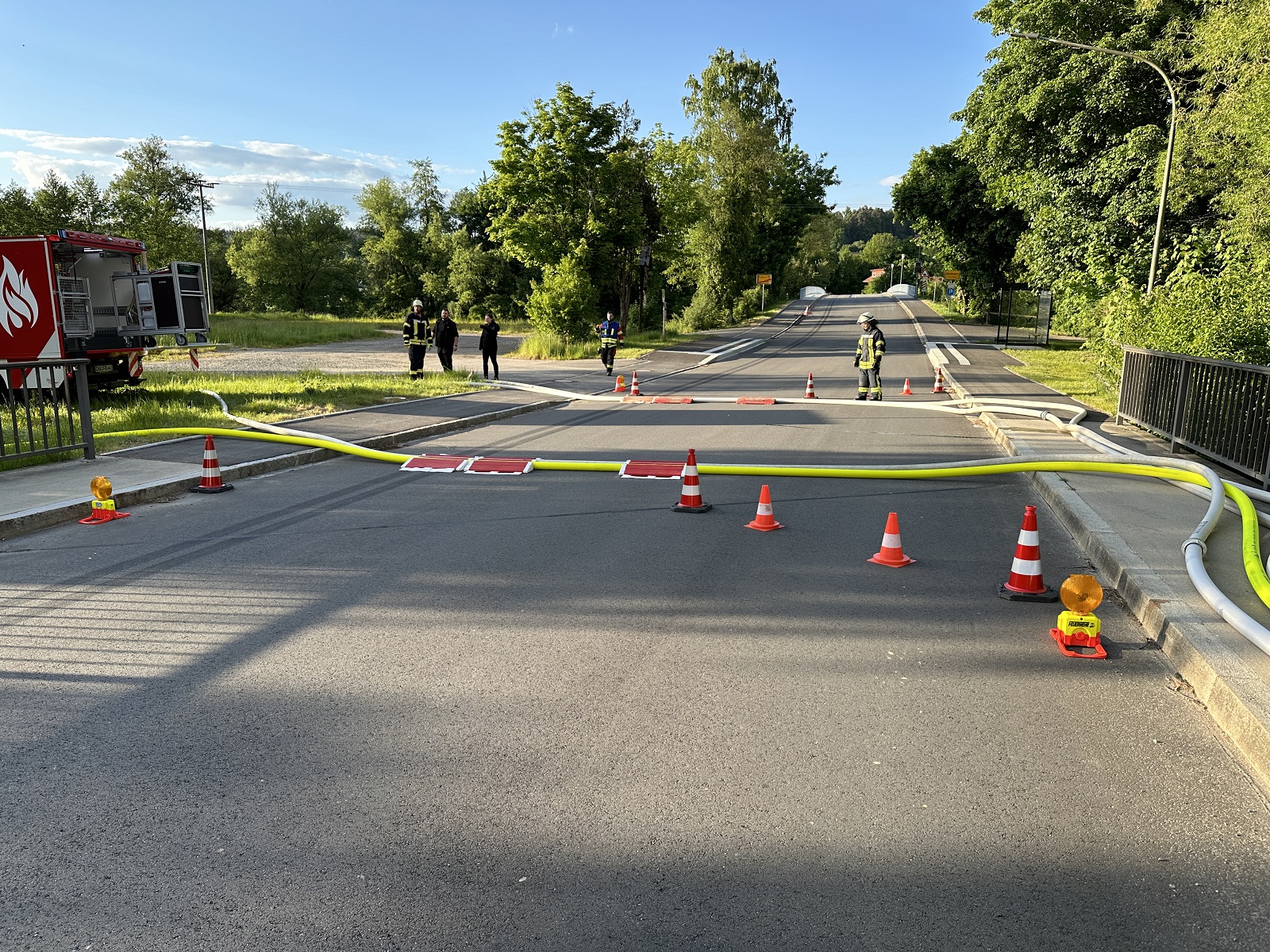 Da bei diesem Objekt im Ernstfall eine immens hohe Wassermenge nötig ist, wurden insgesamt vier Schlauchleitungen zum Objekt verlegt. Die Feuerwehren Bärndorf, Eismannsberg, Weißenregen und Oberndorf fuhren dazu den Regen an und saugten dort mittels Tragkraftspritzen aus einem Nebenarm des Flusses an. Der Schlauchwagen der Feuerwehr Bad Kötzting verlegte von dort aus parallel die vier Schlauchleitungen von der Saugstelle zur Einsatzstelle. Da einmal die Ortsdurchfahrt Kreuzbach sowie die ST 2140 überquert werden musste, galt es zudem, die Schlauchstrecke und die entsprechenden Schlauchbrücken abzusichern. Die Förderleitungen führten durch das Obere Dorf in Kreuzbach bis zum Objekt, insgesamt ca. 500 Meter, bei einem Höhenunterschied zwischen Saugstelle und Übungsobjekt von nur etwa 5 Metern. Noch relativ neu bei größeren Schadenslagen ist das Konzept der Führungsunterstützung, welches auch bei dieser Übung Anwendung fand. Die Feuerwehr Bad Kötzting hatte diese Aufgabe übernommen, um den Einsatzleiter zu unterstützen. Dabei wurde unter anderem eine Lageskizze angefertigt, ebenso wurden wichtige Daten zur Übung dokumentiert.
