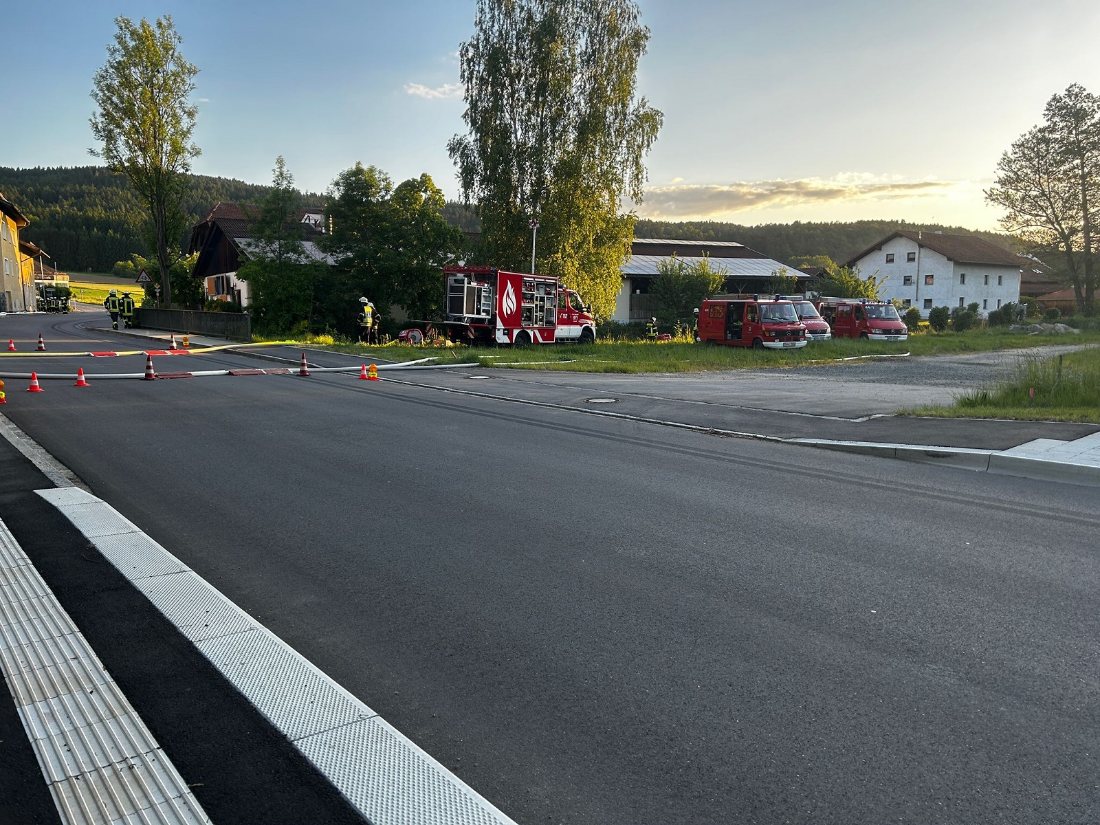 Die Planung der Übung sowie Einsatzleitung oblag unserem Kommandanten Thomas Raab, der um 19 Uhr die Übungsteilnehmer über Funk zum Einsatz beorderte. Neben den Feuerwehren Bärndorf, Eismannsberg, Lederdorn, Miltach und Oberndorf aus unserem KBM-Bereich Miltach waren auch die Wehren Bad Kötzting, Gehstorf, Weißenregen sowie der Schlauchwagenzug aus Bad Kötzting mit KBM Florian Heigl als Zugführer an der Übung beteiligt. Unser LF20 traf als erstes am Übungsobjekt ein und begann sofort mit der Brandbekämpfung sowie der Menschenrettung. Dabei wurde die Wasserversorgung mittels Unterflurhydrant hergestellt. Die zu rettende Person, ein Mitglied unserer Jugendfeuerwehr, wurde im Vorfeld der Übung realistisch geschminkt, sodass der Atemschutztrupp eine offensichtlich verletzte Person im Gebäude vorfand. Im weiteren Übungsverlauf unterstützte die Drehleiter aus Bad Kötzting vorm Übungsobjekt mit einer Widerstandslinie zum angrenzenden Gebäude, die Feuerwehr Miltach übernahm die Widerstandslinie auf der Rückseite des Gebäudes, zudem wurden von ihnen weitere Atemschutztrupps eingesetzt, um Gasflaschen aus dem Gebäude zu bergen und Messungen durchzuführen. Auch die Feuerwehr Feuerwehr Lederdorn führte einen Löschangriff durch und nahm die vorhandene Sprinkleranlage in Betrieb, da ebenfalls angenommen worden war, dass ein Tankwagen eben beim Befüllen stand. Die Atemschutzüberwachung wurde dabei von unserem Mehrzweckfahrzeug aus durchgeführt, insgesamt waren sechs Atemschutztrupps im Einsatz. Sie hatten dabei auch die Aufgabe, mehrere Gasflaschen aus der Abfüllanlage zu bergen und zu kühlen, diese wurden anschließend in einiger Entfernung vom angenommenen Brandobjekt gelagert.
