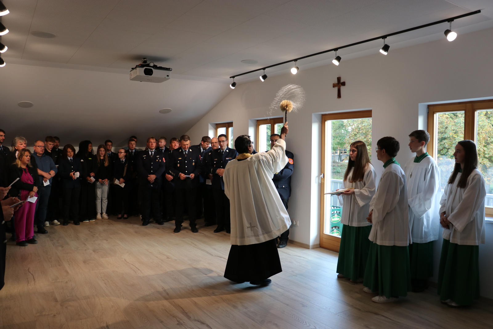 Seit November 2024 wurde im Obergeschoß unseres Feuerwehrhauses von zahlreichen engagierten Vereinsmitgliedern aber auch weiteren Helfern und Firmen tatkräftig angepackt und alle Räumlichkeiten saniert. Zahlreiche Vereinsmitglieder, Feuerwehrführungskräfte, Vertreter der Gemeinde und weitere Gäste fanden sich zuerst zum gemeinsamen Gottesdienst in der Pfarrkirche ein. Anschließend segnete Ortspfarrer Pater Joseph Santhappan (MSFS) die Räumlichkeiten im Gerätehaus.