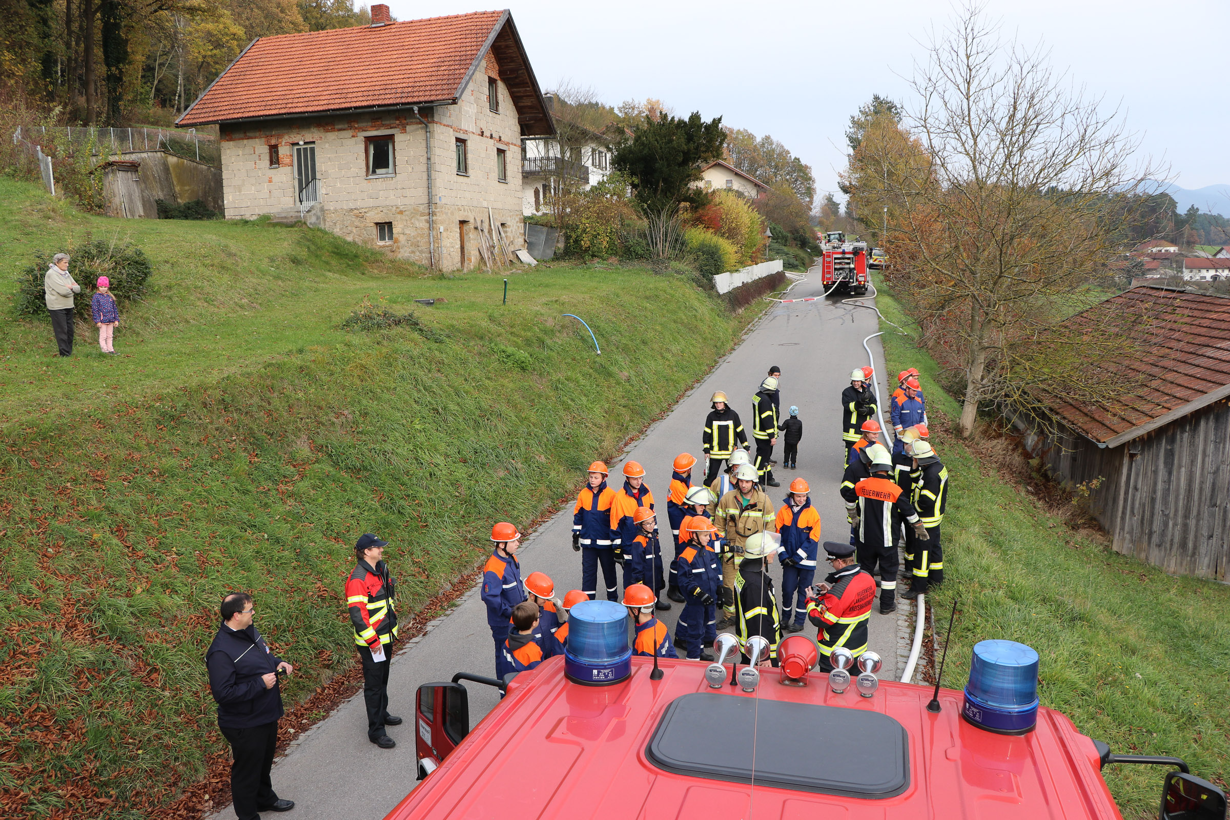 Auch Kreisbrandinspektor Andreas Bergbauer wohnte eine Weile dem Übungsgeschehen bei, ehe er einen weiteren Termin wahrnehmen musste. Nachdem auch die zweite Förderleitung mit Wasser gefüllt war, wurden zusätzlich zu den ersten C-Rohren und einem C-Hydroschild noch weitere Strahlrohre am Übungsobjekt vorgenommen.